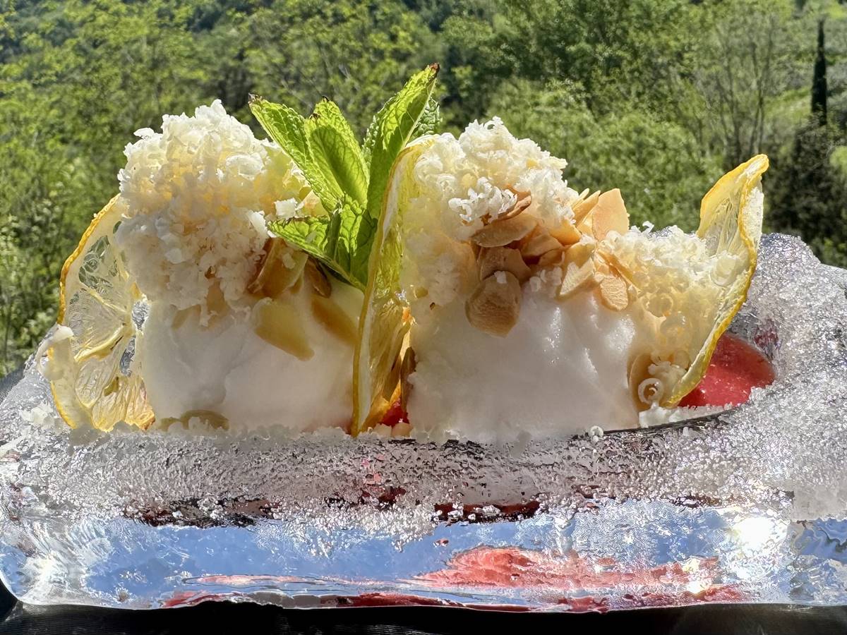 Buz küpü şeklinde hazırlanmış limon sorbesi, çilek sosu, sedir özü, kavrulmuş badem ve 24 aylık keçi peyniri.